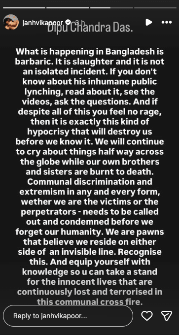 Janhvi Kapoor is not alone in her outcry. Her statement aligns with official condemnations from the Government of India and several U.S. Lawmakers, who have called on the Bangladesh interim administration to ensure the protection of religious minorities.