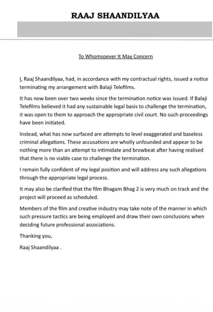 Responding to these claims, Shaandilyaa clarified that he has already exercised his right to end the partnership. “In accordance with my contractual rights, I issued a notice terminating my arrangement with Balaji Telefilms,” the filmmaker stated.