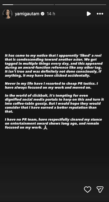 “Celebrities are frequently tagged in hundreds of posts every day. The reel in question likely appeared during a flurry of interactions related to recent award-function references. It was not a deliberate attempt to endorse any negative sentiment toward a fellow colleague,” Yami’s statement read.